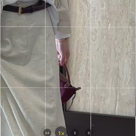 Beige linen blend co-ord including a maxi skirt and a longline shirt. Maxi length skirt with two functional buttons and a zipper. Longline shirt with buttons and side splits.